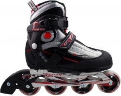 The Roller Derby Spartan 8.8 men's inline fitness skates are crafted with a soft external boot design and a custom memory fit lining to provide a comfortable ride and performance. The combination of the Ultra heel and ankle support and the tri-system of laces, a power strap, and a buckle offer improved foot and ankle support. The aircraft aluminum frame holds 80-mm Labeda Aires Pro wheels with BEVO ABEC 9 chrome bearings.