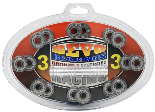 Precision bearings, chrome steel inner and outer race, AKS chrome steelballs, serviceable shields, BEVO speed spacers included.